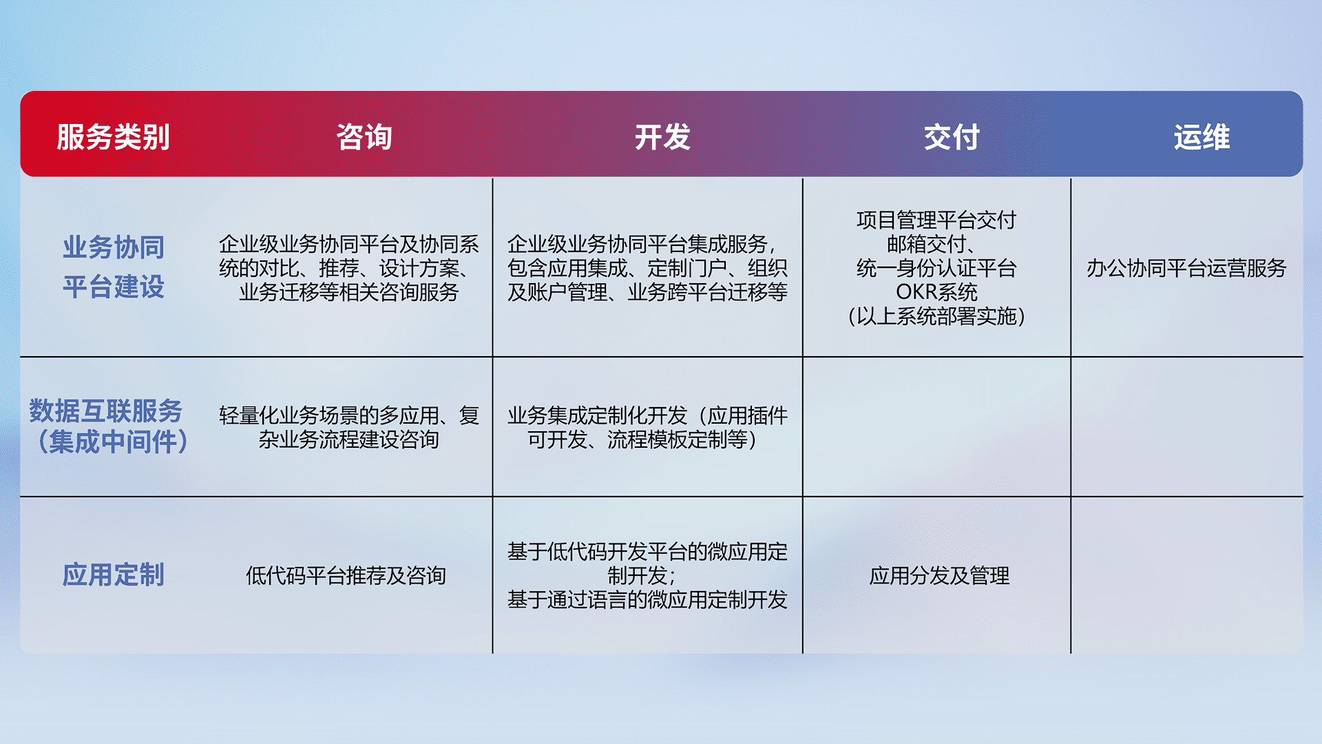 针对钉钉、、企微、、、、IDaas等平台级产品提供产品的规划、、、、方案、、、交付、、、定制化开发等服务,,,实现如统一协同办公、、、智能客户服务、、混合会议管理、、、智能数据查询、、、等业务场景,,,实现数字化转型。。。。